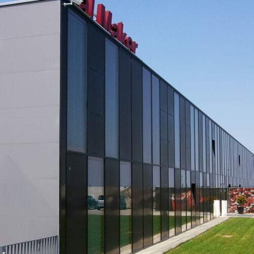 Die Länge des Baukörpers, bedingt durch die Anforderungen der Produktion, wurde architektonisch mit einer Alu-Glas-Pfosten-Riegel-Fassade beantwortet. Diese interpretiert die Grundelemente – festes Sonnenschutzglas und öffenbare Paneele – als rhythmisches Fassadenspiel. Die gesamte Konstruktion wurde aufgrund der großen Spannweiten in Stahl ausgeführt, wodurch auch unterschiedliche Raumnutzungen von außen ablesbar gemacht werden konnten.