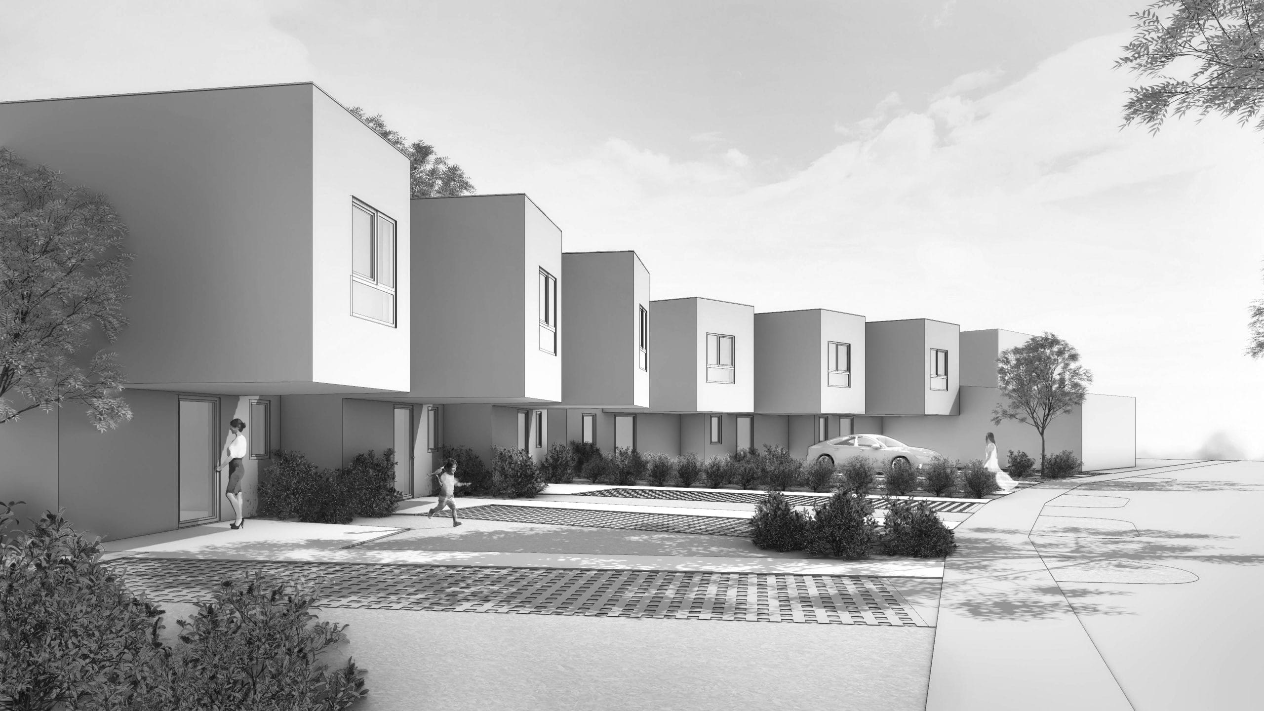 Für die Wohnbaugenossenschaft konnten trotz des engen Budgets funktionale Grundrisse mit neuen Raumvisionen für die neuen Bewohner umgesetzt werden. Die Vor- und Rücksprünge über den Eingängen der Reihenhäuser bilden durch ihre Ausformulierunen differenzierte Freiräume und gliedern die Fassade.